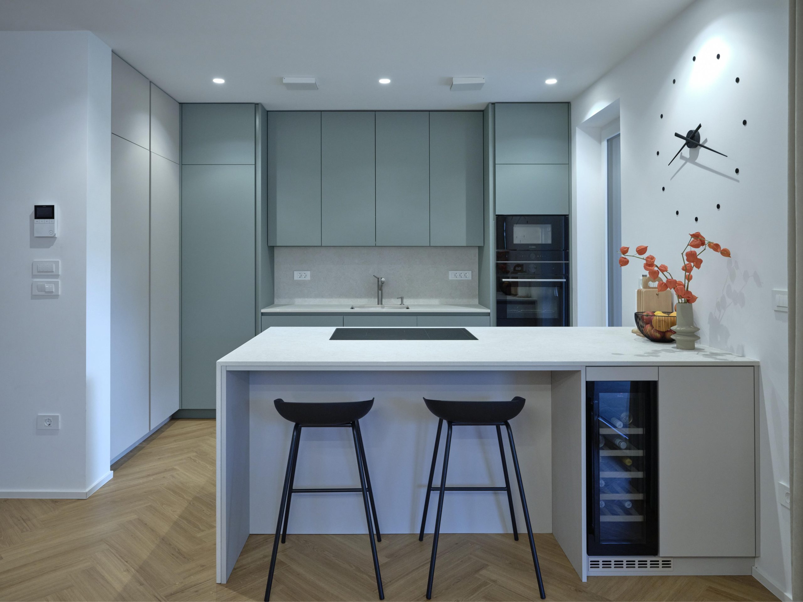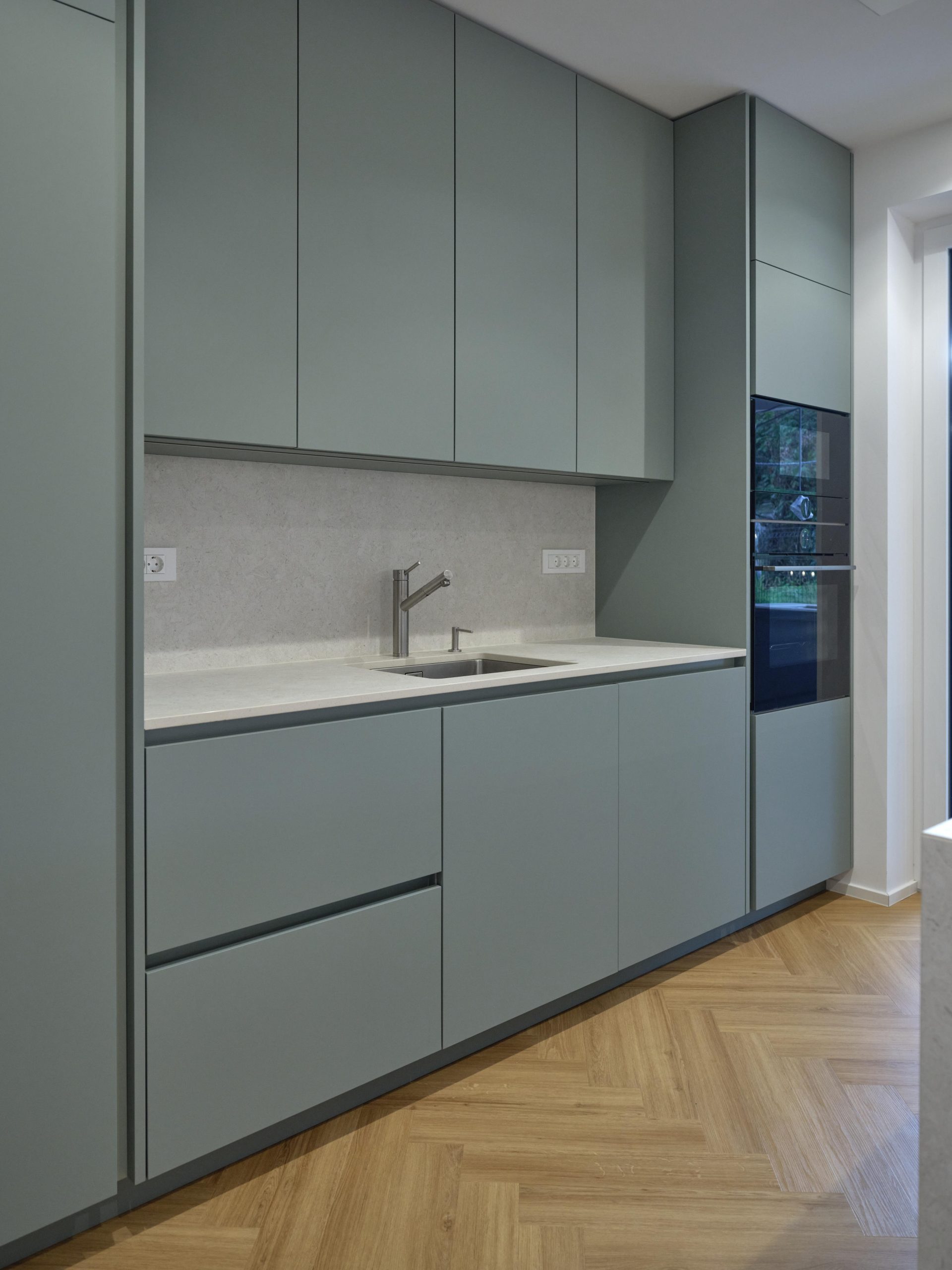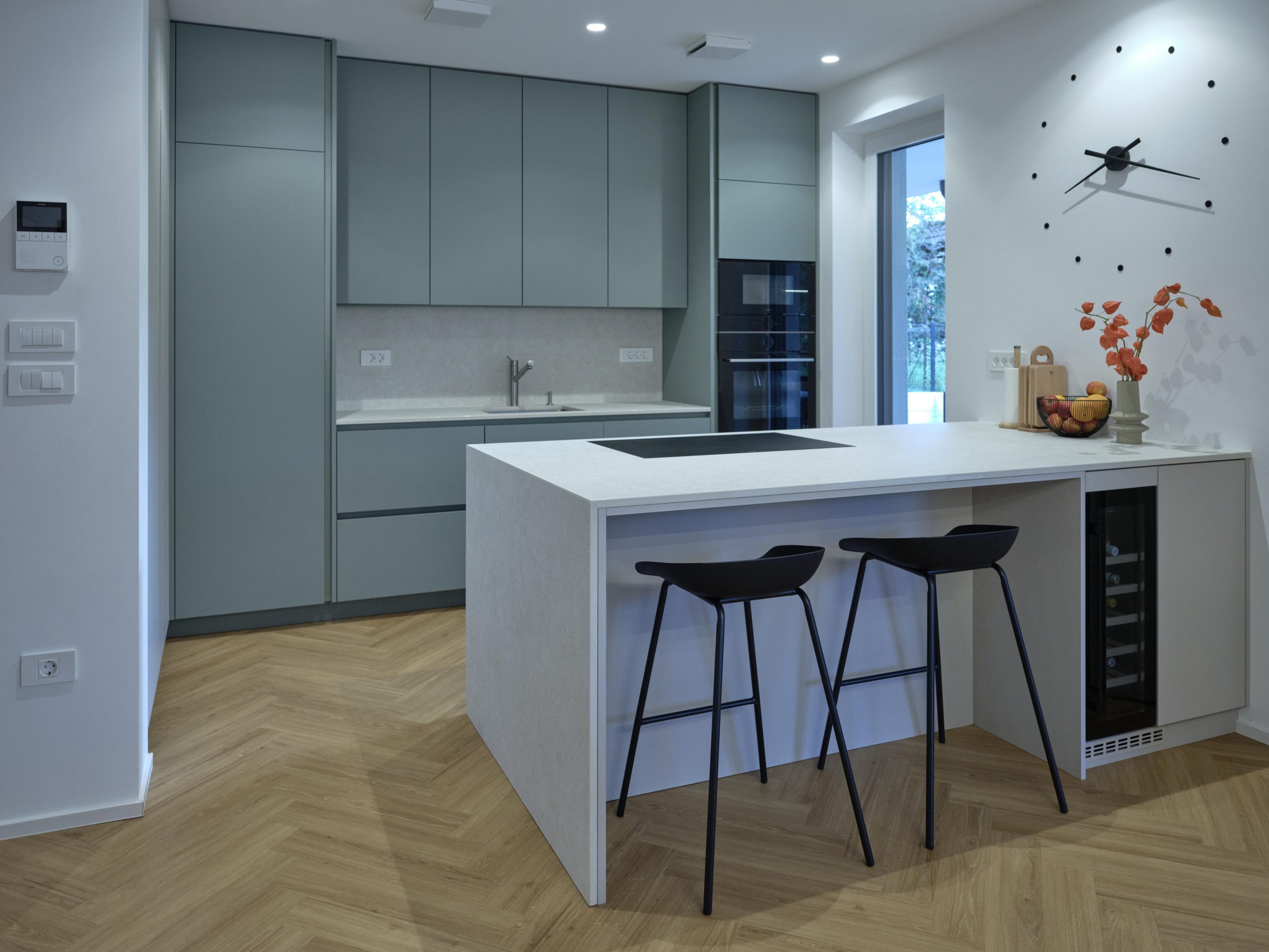 V moderni otočni kuhinji smo kombinirali nežno zeleno barvo in kašmir.