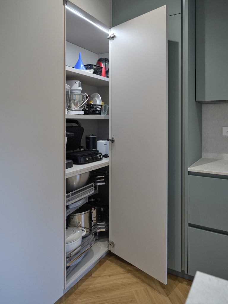 V visoki omari je v kotu še dodatna odlagalna površina in kotni element ledvička.